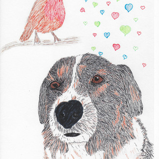 Seine Besitzer gaben ihn nun frei, doch wohin mit ihm? Silvia hätte ihn gerne in ihr Rudel aufgenommen, doch bei ihr war schon alles voll. So wurde er schließlich in einer Pension untergebracht, um dort erst einmal wieder zur Ruhe zu kommen. Dort wurde er gut versorgt doch es zeigte sich, dass Noel mittlerweile völlig überfordert und traumatisiert war und dringend einen Platz benötigte, wo er einfach sein durfte und niemand etwas von ihm erwartete. Wir - Ute, Birgit und ich - hatten Bilder von ihm in der Pension gesehen und sein Blick ließ uns nicht los. Wie lange überlegten wir hin und her, doch uns wollte keine Lösung einfallen. In dieser Zeit zeichnete Ute Bilder von ihm und nach und nach entstanden einige Geschichten von Karma Klaus über ihn und seine Brüder. Wir hofften, ihm auf diese Weise gute Energie mit auf den Weg zu geben, ihm zu helfen, sich nicht aufzugeben, während wir nach einer Lösung suchten.